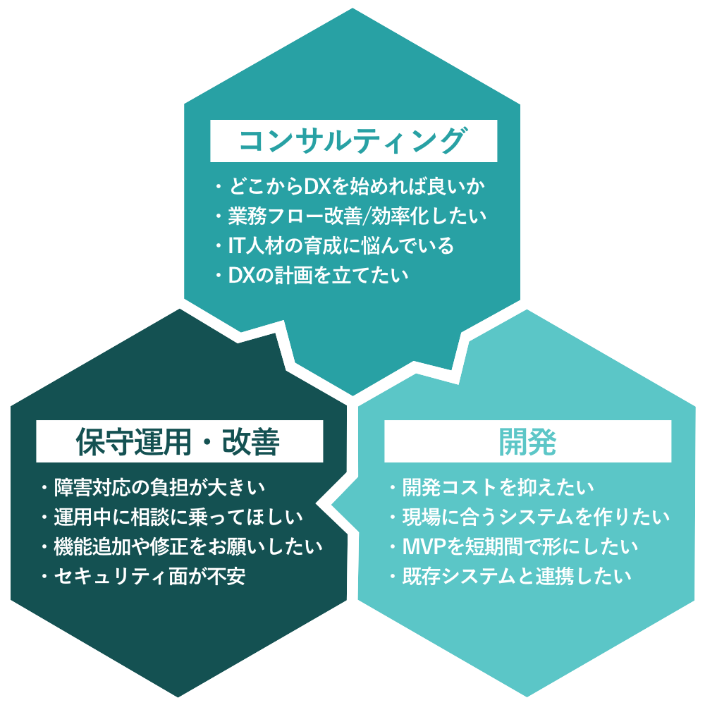 従来のIT企業が得意とするのは、要件に沿ってシステムを構築する“守りの開発”。しかし、そこからは新しい技術やお客様の抱える課題への柔軟かつ迅速な対応は生まれにくく、結果的に「言われたものを作る」だけになってしまいがちです。