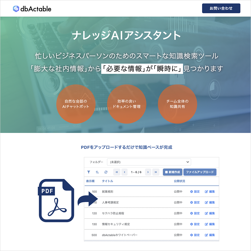 過去の提案書や商品仕様を瞬時に検索。商談準備や顧客対応がスピーディになり、ビジネスチャンスを逃しません。ローコード開発SaaSプラットフォームdbActable